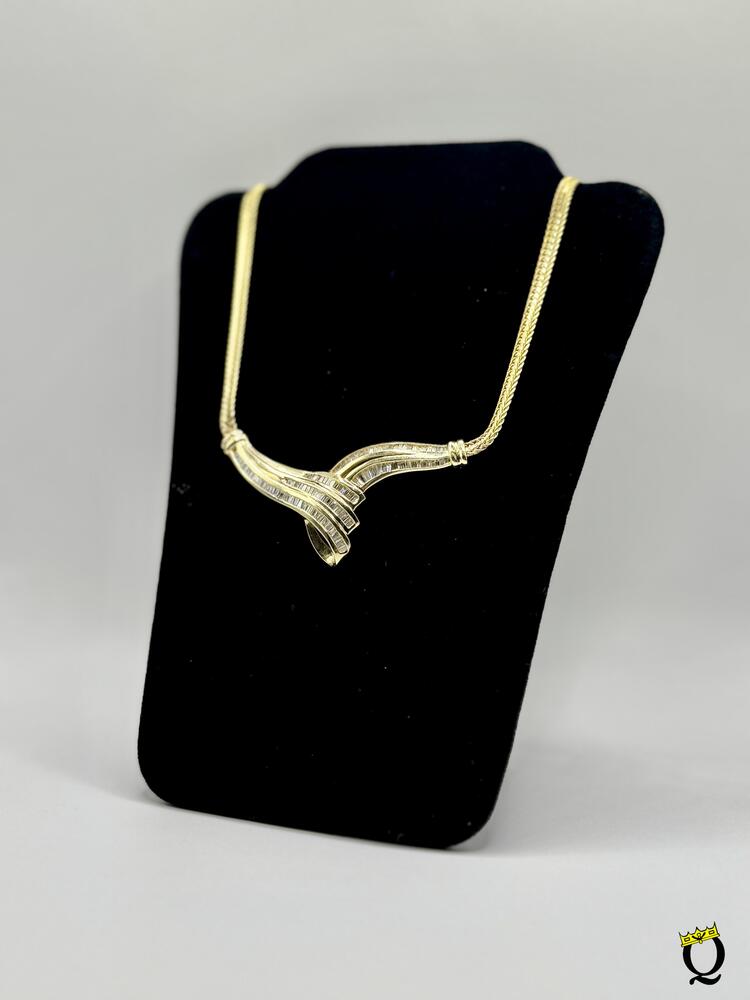 This exquisite 14K Yellow Gold Diamond Cluster Necklace showcases a sweeping, elegant design set with an impressive 3.00 carats of sparkling natural diamonds. Weighing 19.9 grams and measuring 18 inches in length, it features a striking V-shaped centerpiece crafted with a seamless combination of baguette-cut and round diamonds that create extraordinary brilliance and dimension. The polished gold links offer a refined finish, making this necklace perfect for formal events, anniversaries, or elevating any luxury jewelry collection. Sophisticated, radiant, and expertly crafted—this piece delivers timeless glamour with every wear.