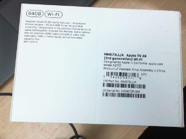 TV's APPLE TV 4K 3RD GEN 64GB MEDIA STREAMER BLK WIFI W. REMOTE & CHARGER IN OG BOX