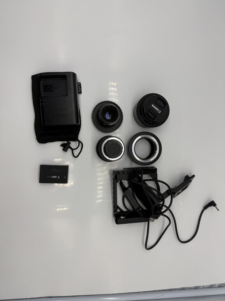 Includes; 2 lens, 2 adapters, 1 battery, charger, and mount