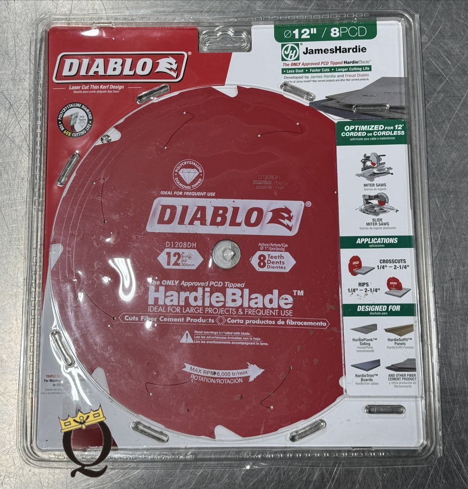 The Diablo D1208DH is a durable 12-inch blade, with eight Polycrystalline Diamond (PCD) teeth, designed specifically for cutting fiber cement materials. Its high-performance design significantly extends cutting life, making it the ideal tool for dealing with projects involving Hardie products.