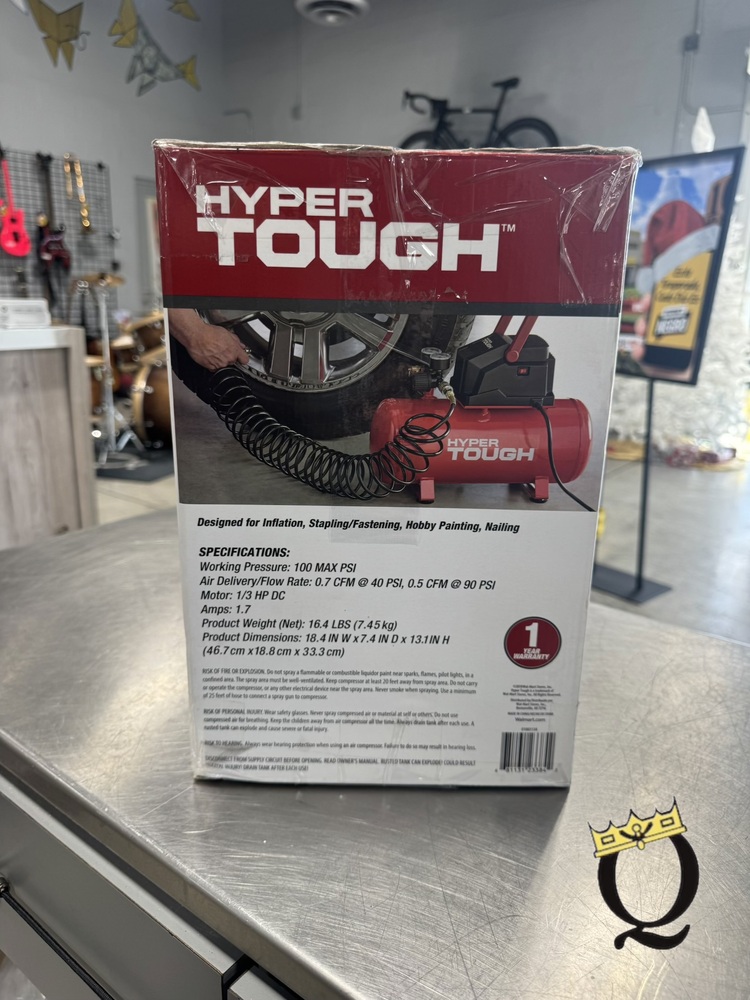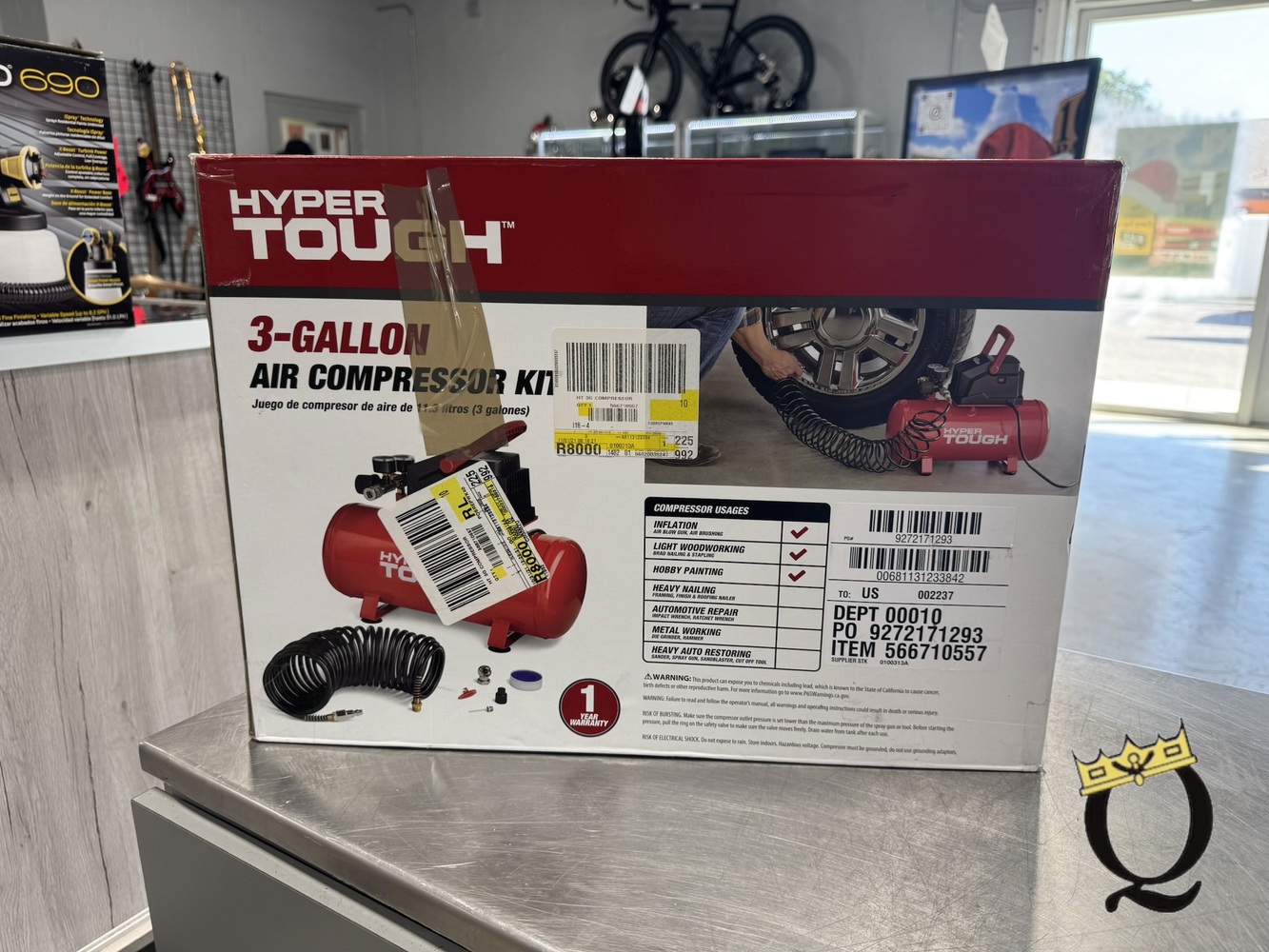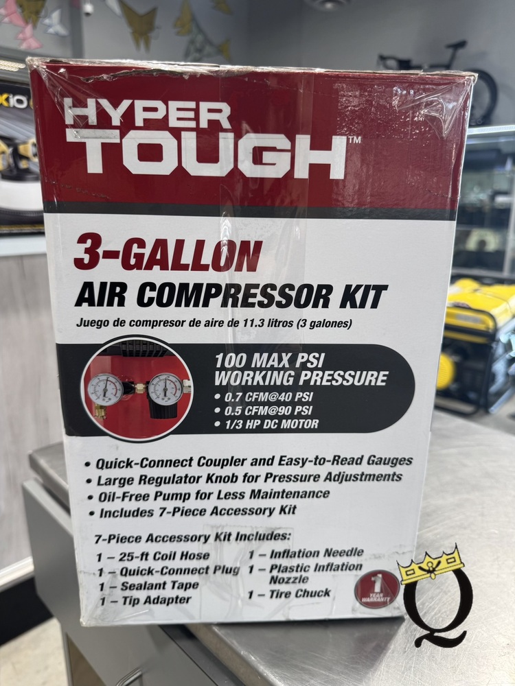 The Hyper Tough 3-Gallon Air Compressor is a compact, high-efficiency tool designed for inflating, cleaning, and operating pneumatic tools. With a max pressure of 100 PSI, it features an oil-free pump for low maintenance, a quick connector for easy tool change and a 1HP UMC motor.