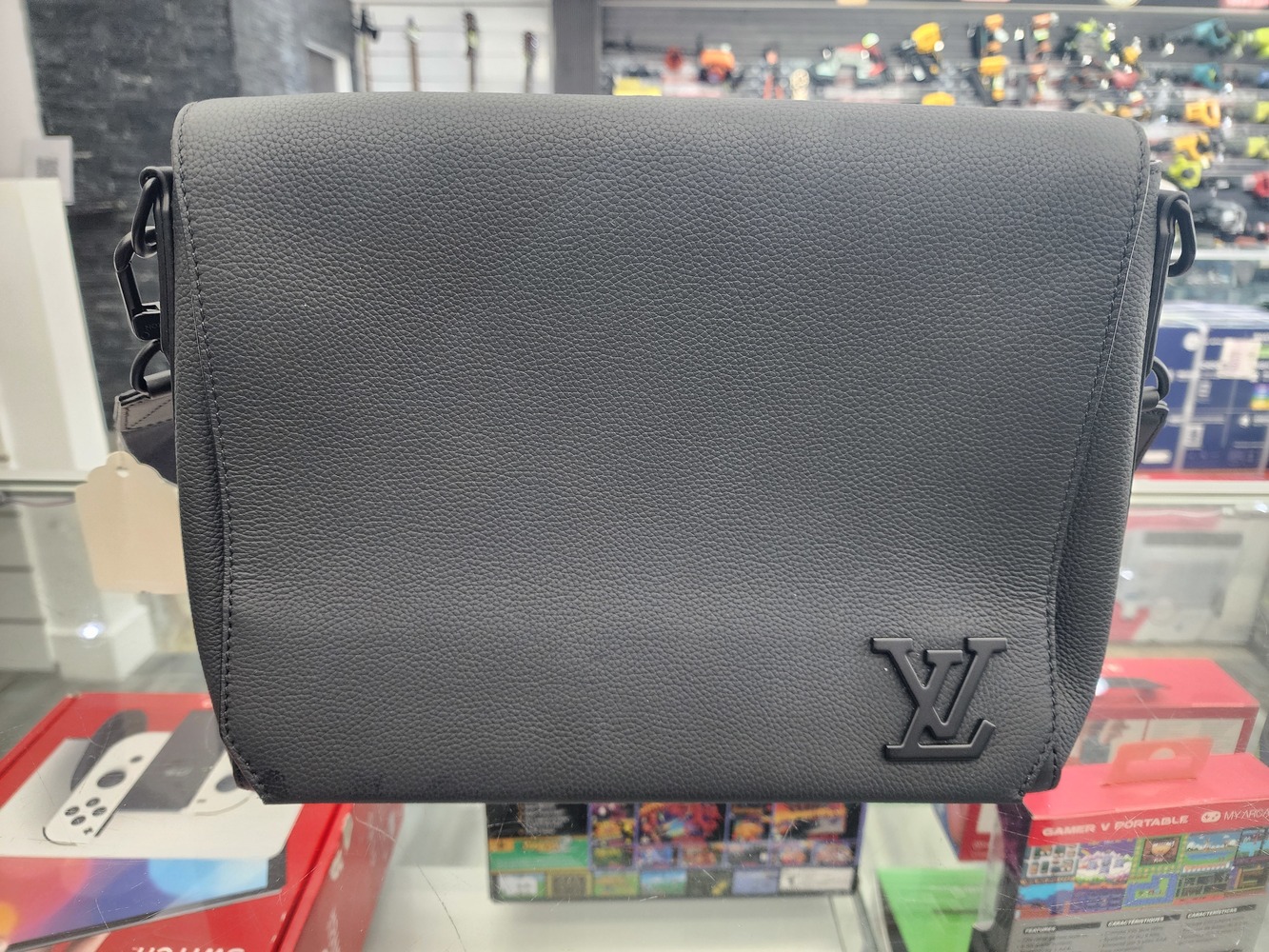 Introducing the Louis Vuitton Takeoff Messenger bag, a sophisticated and modern accessory from the exclusive LV Aerogram collection. Crafted from sumptuous grained calf leather in a sleek black finish, this crossbody messenger bag exudes understated luxury. The front flap is adorned with a tone-on-tone, matte black LV logo, adding a subtle yet unmistakable touch of brand identity. It features an adjustable textile strap with a jacquard-woven "Louis Vuitton" signature, offering both comfort and iconic style. Perfect for the modern man on the go, this bag's clean lines and minimalist design make it a versatile and timeless addition to any wardrobe.