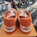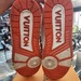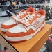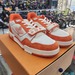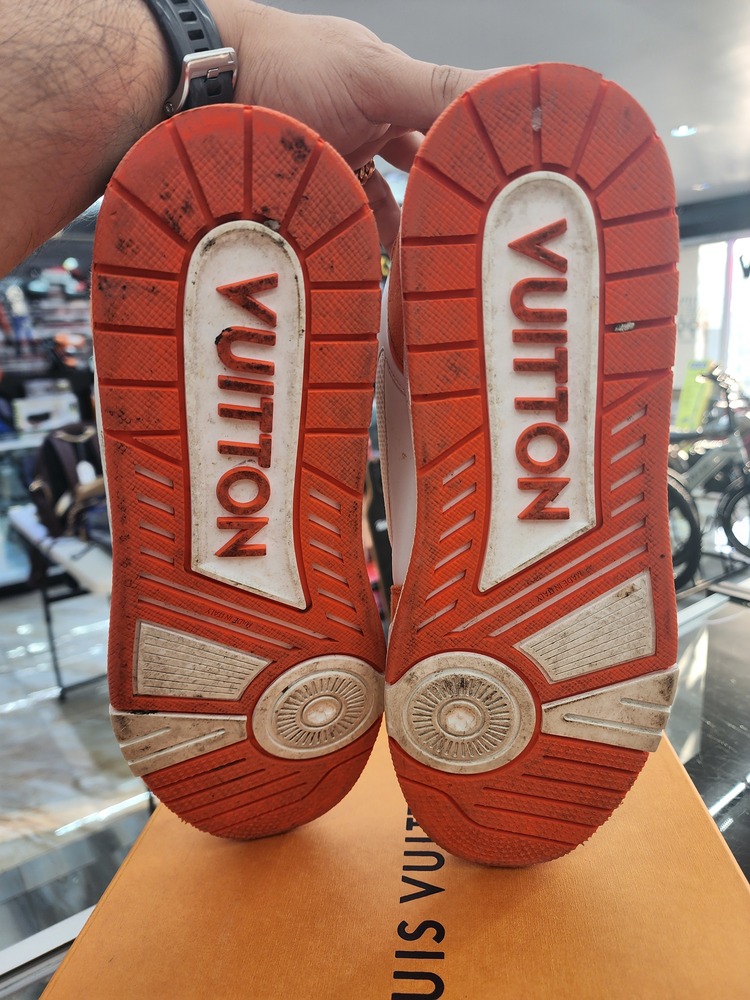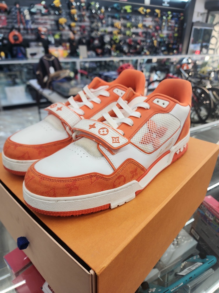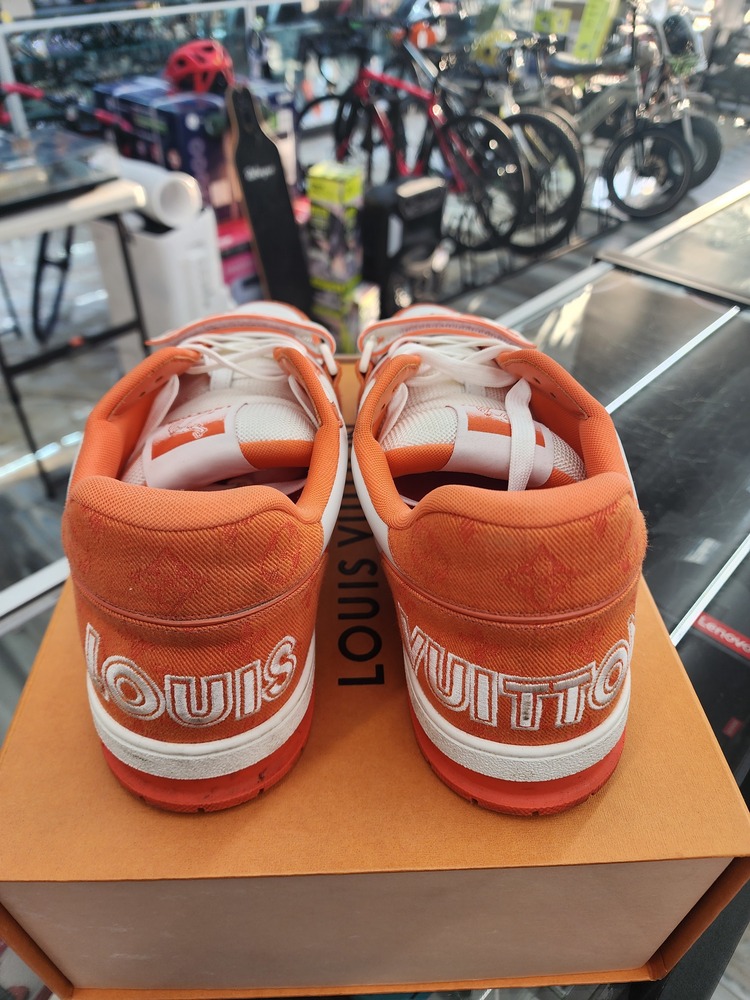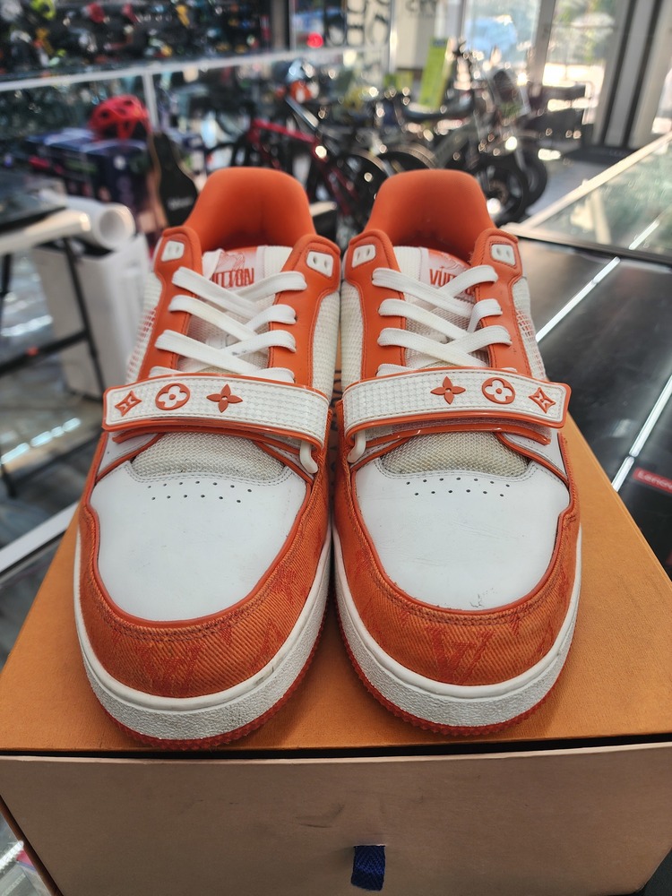 Step into the epitome of casual luxury with the LV Trainer sneakers, a design by the late Virgil Abloh inspired by vintage basketball shoes. This particular version, featuring a vibrant orange and white colorway, is crafted from a mix of premium materials including leather and monogram denim. The elaborate construction is a testament to Louis Vuitton's skilled craftsmanship, with each pair taking up to seven hours to stitch.