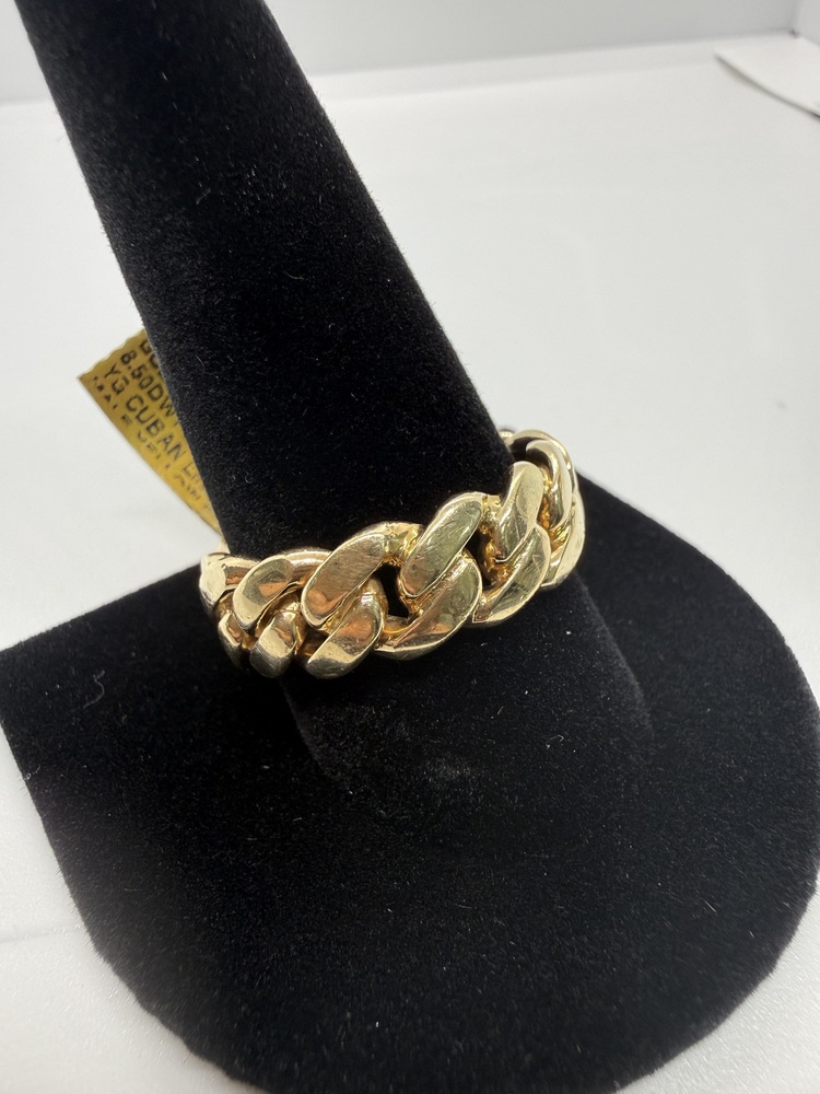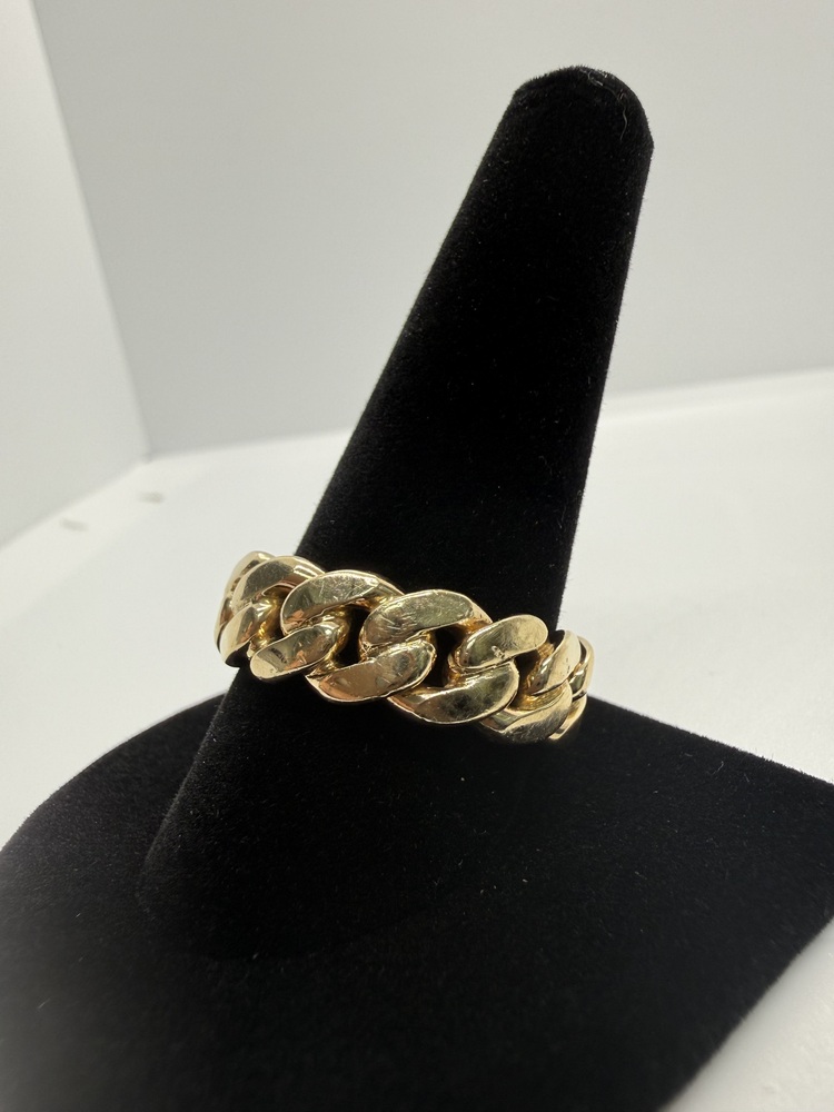 Dress your finger in luxurious opulence with our 12kt Yellow Gold Cuban Link Ring. Sized perfectly at 11, this 8.50dwt masterpiece aptly suits the modern man's taste. Its undeniable charm lies in its distinctive yellow gold Cuban link design - expertly crafted to add a dash of masculinity and elegance. Experience the luxurious feel and robust strength of yellow gold in every day wear. This enchanting ring is your next must-have piece!