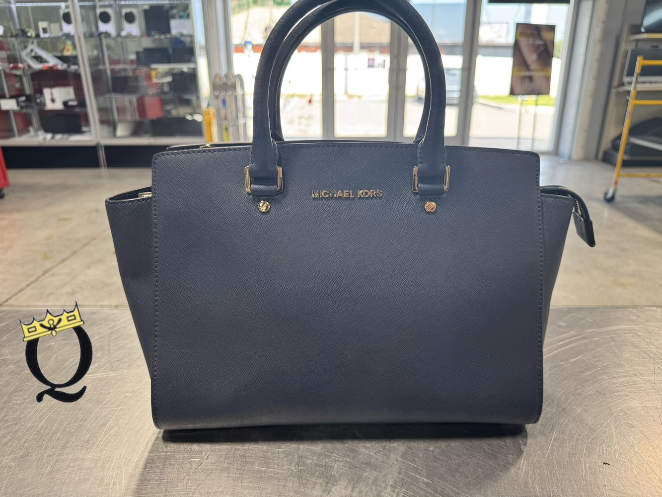 The Michael Kors Selma Satchel in navy is a timeless accessory defined by elegance. Crafted from Saffiano leather, this sophisticated bag features a spacious interior, multiple compartments, and a sturdy crossbody strap. Resilient to scratches, its exquisite design ensures durability and fashionable articulation. An ideal accessory for everyday luxury.