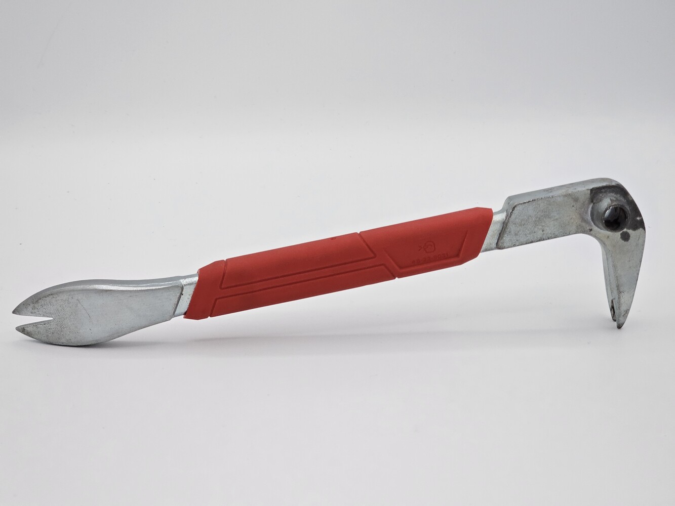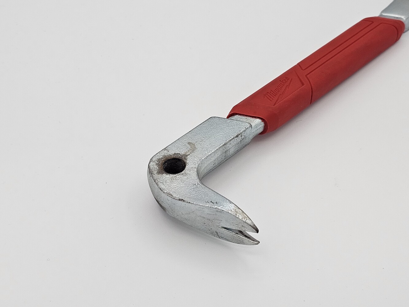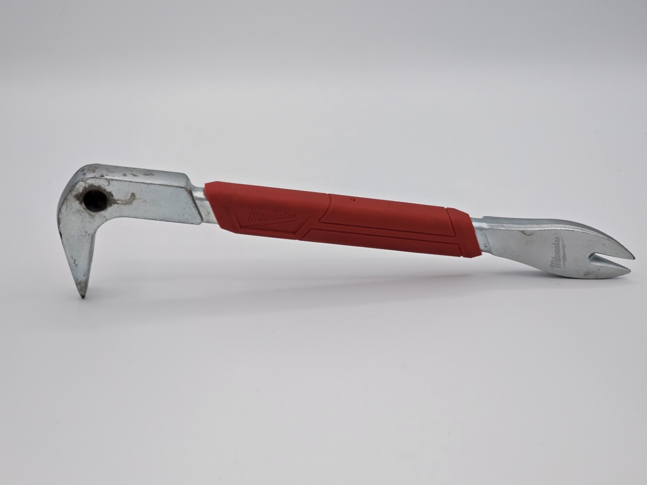 This sale is for a Milwaukee nail puller with a high leverage head. The nail puller is about 10 inches in length with a red safety handle. The tool featured in this sale is used in good condition: there are some stains on the head and the bottom end of the tool.