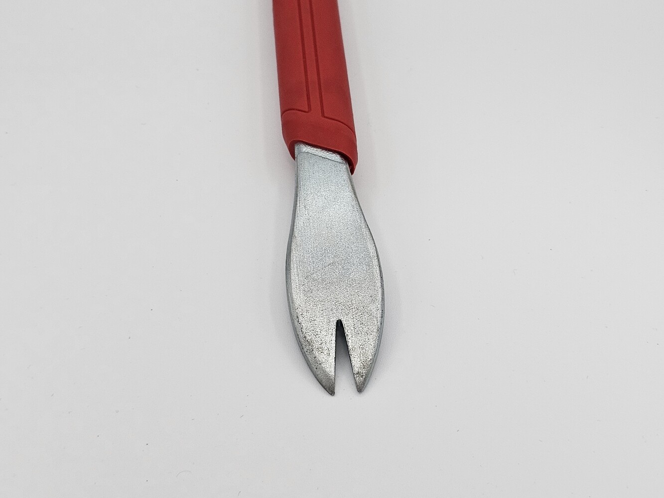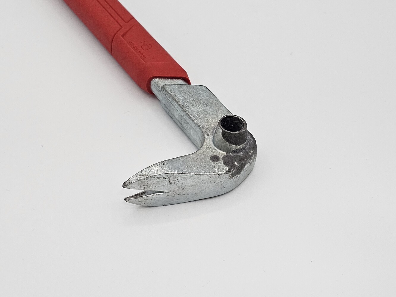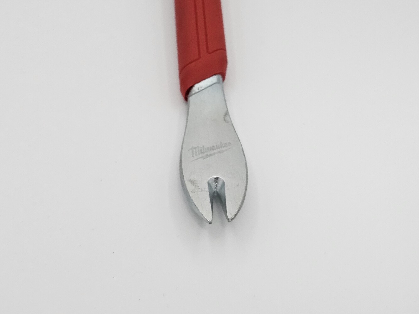 This sale is for a Milwaukee nail puller with a high leverage head. The nail puller is about 10 inches in length with a red safety handle. The tool featured in this sale is used in good condition: there are some stains on the head and the bottom end of the tool.