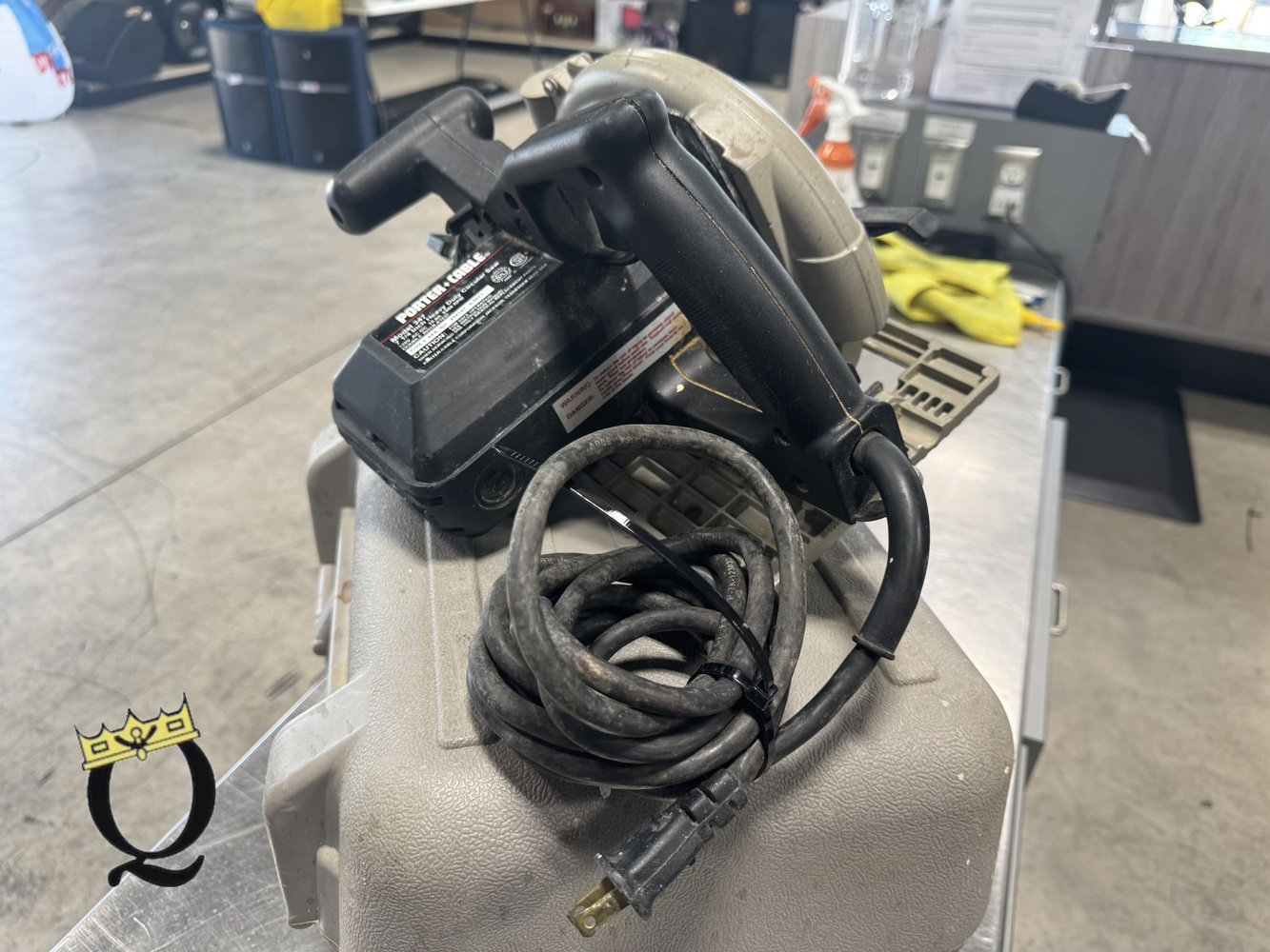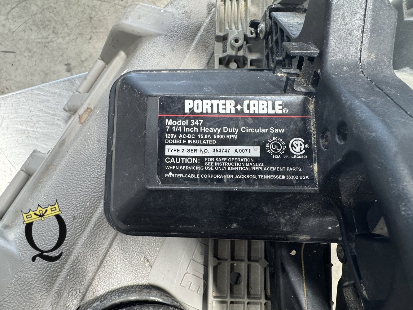 The PORTER CABLE Model 347 Circular Saw provides reliable cutting with a half-inch blade. Durable and user-friendly, it ensures comfortable control. Ideal for heavy-duty construction and woodworking, it comes with a protective case for storage and transportation.