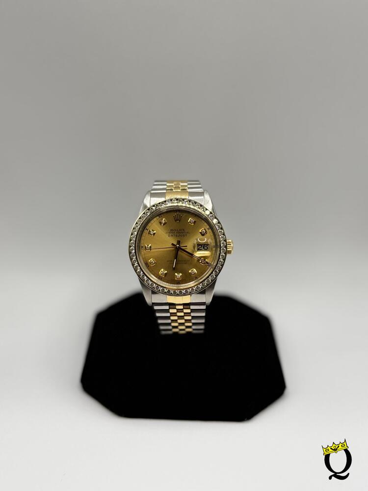 This classic Rolex Datejust 36mm, model 16013, features a timeless two-tone design crafted from stainless steel and 18k yellow gold. The champagne dial is accented with diamond hour markers, adding refined elegance to its iconic look. It is paired with the signature Jubilee bracelet, known for its comfort and sophistication. This piece is upgraded with an aftermarket diamond bezel, enhancing its brilliance and presence on the wrist. Powered by a reliable automatic movement and equipped with a date display at 3 o’clock, this watch blends enduring style with everyday functionality. Watch only — no box or papers. A standout vintage-inspired luxury timepiece with added sparkle.