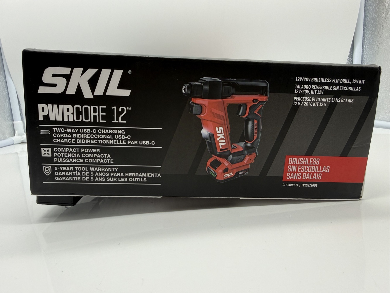 The SKIL PWR CORE 12/20V DL6300D-11 is a 12-volt cordless drill, featuring a 1/4-in keyless chuck. It boasts a brushless motor for exceptional performance, longevity and reduced maintenance. The unit is powered by a state-of-the-art lithium battery ensuring long-lasting, dependable power.
