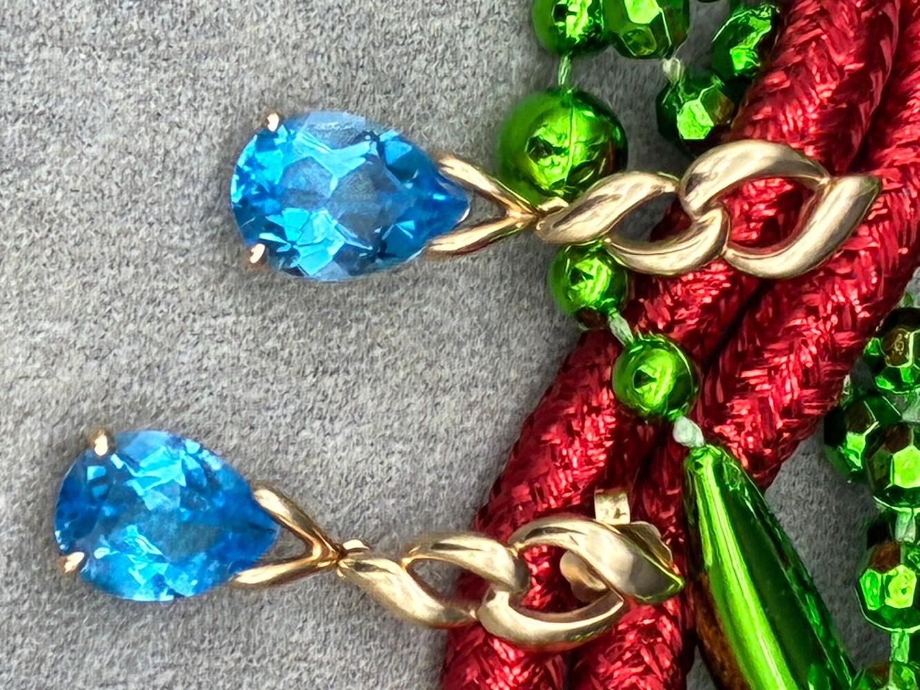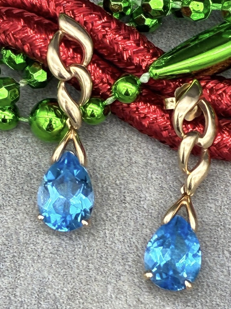 Experience timeless elegance with these stunning 14kt gold earrings. Weighing 2.20 Dwt, they exude luxury and class. Gracefully designed with tear-drop blue stones, these jewels promise to add a pop of color to your attire. Anchored by 14k chains, they create a delicate, floating effect, perfectly capturing the beauty of celestial hues. Don't miss out on indulging yourself or gifting this unique treasure.